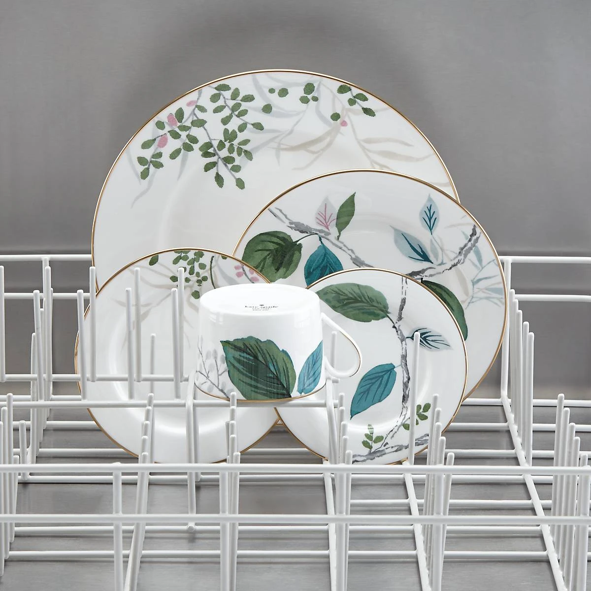 Delicate watercolor-inspired florals give a hand-painted feel to this Birch Way collection for a whimsical accent to fine dining. This 5-piece place setting is crafted of durable white bone china, with 24k gold accents, and is both dishwasher-safe and tarnish-resistant.