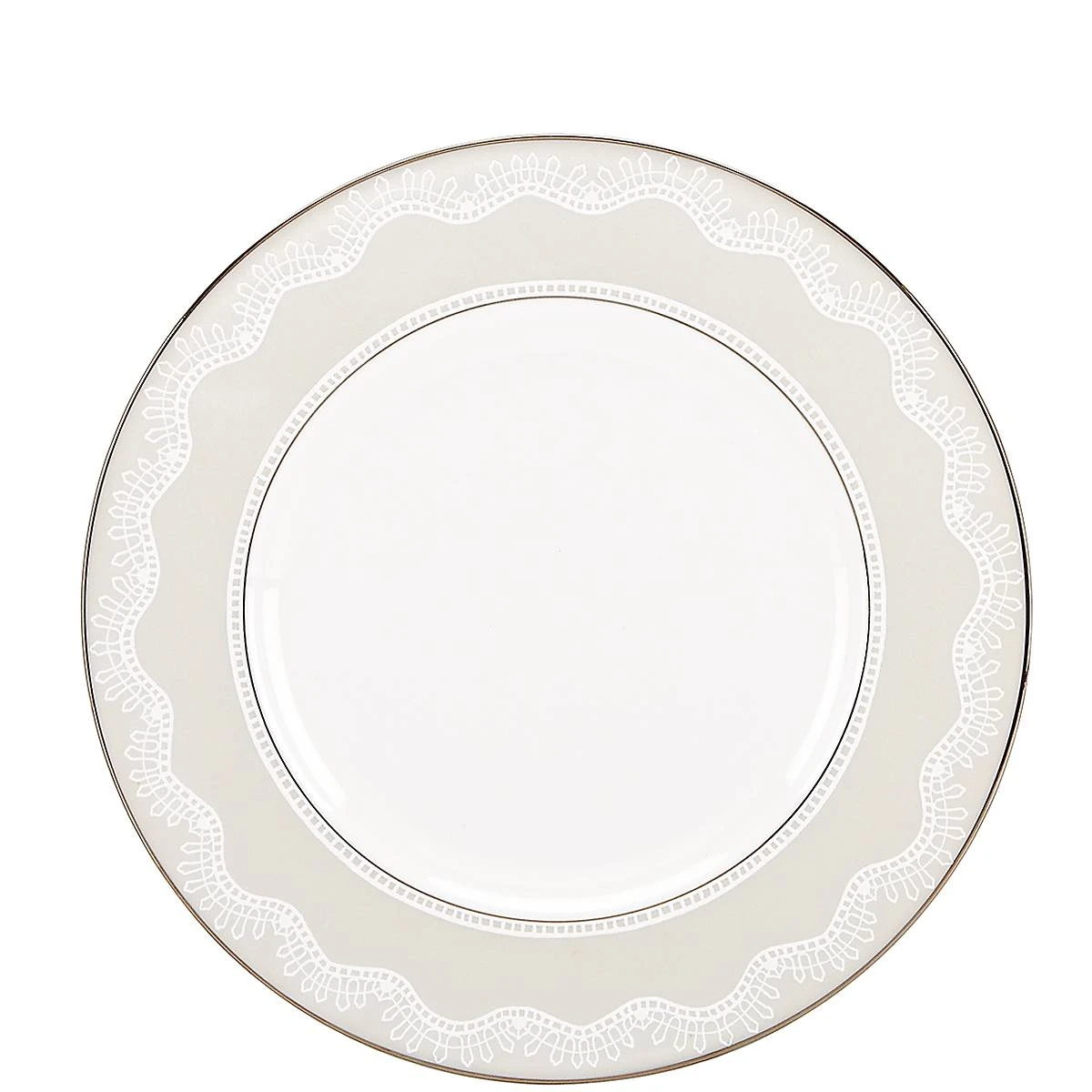 Delight future dinner guests with this chic new collection of durable white bone china. The Chapel Hill Accent Plate is trimmed with a delicate chantilly lace design, that evokes romance, whimsy and vintage wedding veils. This dish features accents in precious platinum, and is dishwasher-safe.