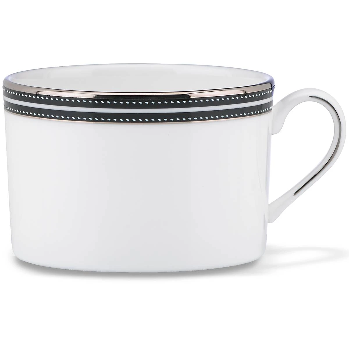 White raised “stitches” with black banding and platinum details give the kate spade new york Union Street Cup a sophisticated look. This is chic bone china dinnerware, perfect for any occasion.