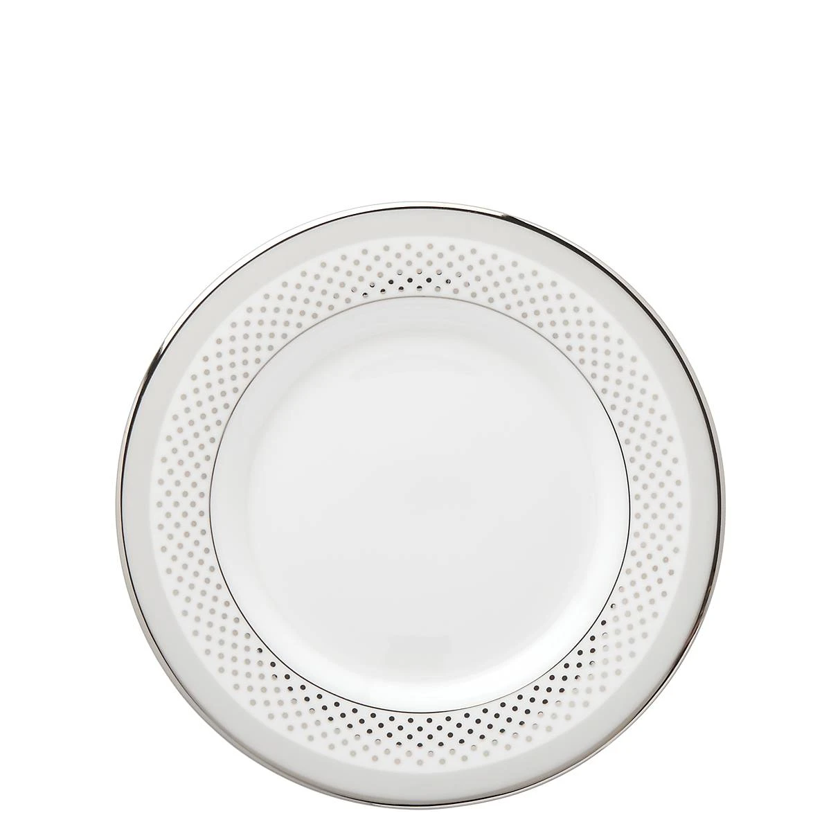 Shining white bone china is trimmed in precious platinum to create the kate spade new york Whitaker Street Saucer Decorated with platinum trim, pearl grey edges, and a hint of delicate dots, the saucer is both tailored and elegant. Dinnerware that is perfect for formal occasions, Whitaker Street is sure to add style and a bit of glamour to any table.
