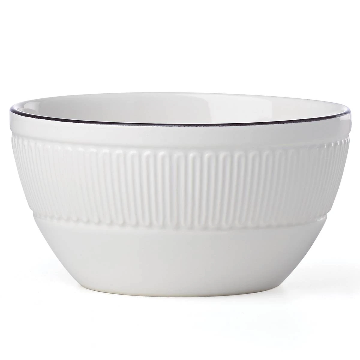 Grosgrain detailing, rich black trim, and a crisp white finish highlight this chic dinnerware from Kate Spade New York. Crafted from durable ironstone, the York Avenue Fruit Bowl is microwave and dishwasher-safe.