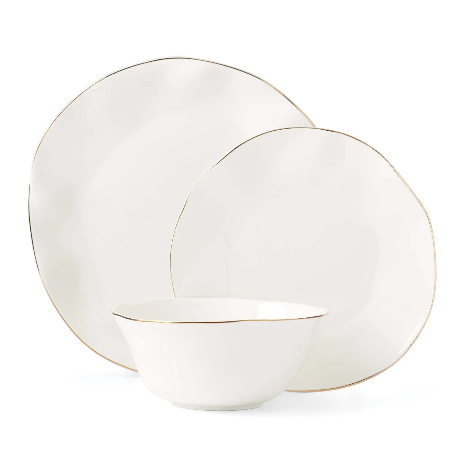 Get everything you need with the Blue Bay 12-piece dinnerware set in creamy white. Mix this set with your current Blue Bay collection or match with your dinnerware favorites! This set includes dinner plates, dessert plates and bowls, so that you can serve everything from the main course to after-dinner treats. This sweetly simple set features a thin gold rim on each piece for a unique accent and it’s both dishwasher and microwave safe!