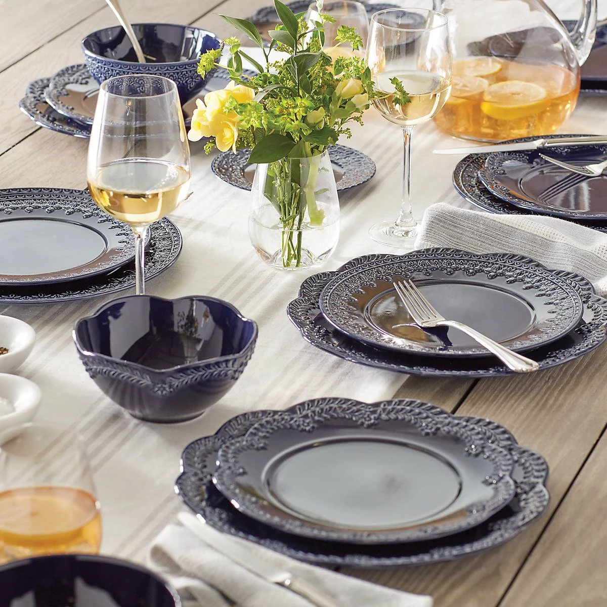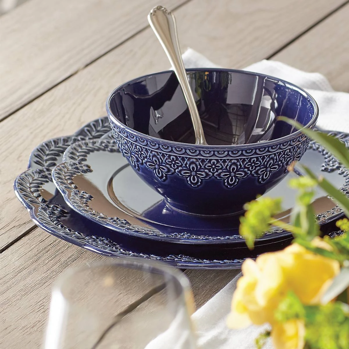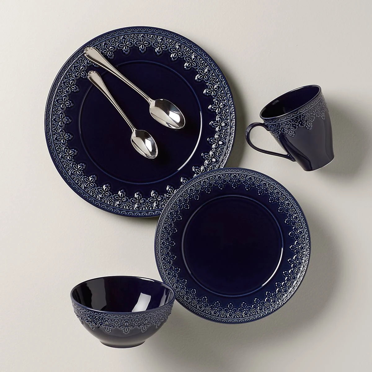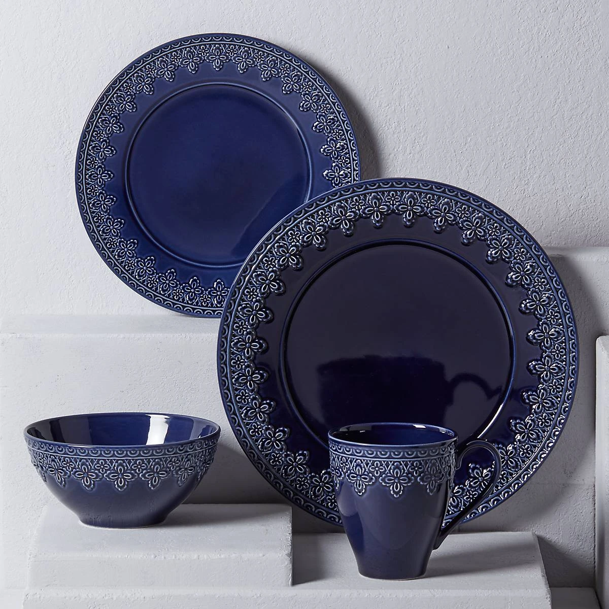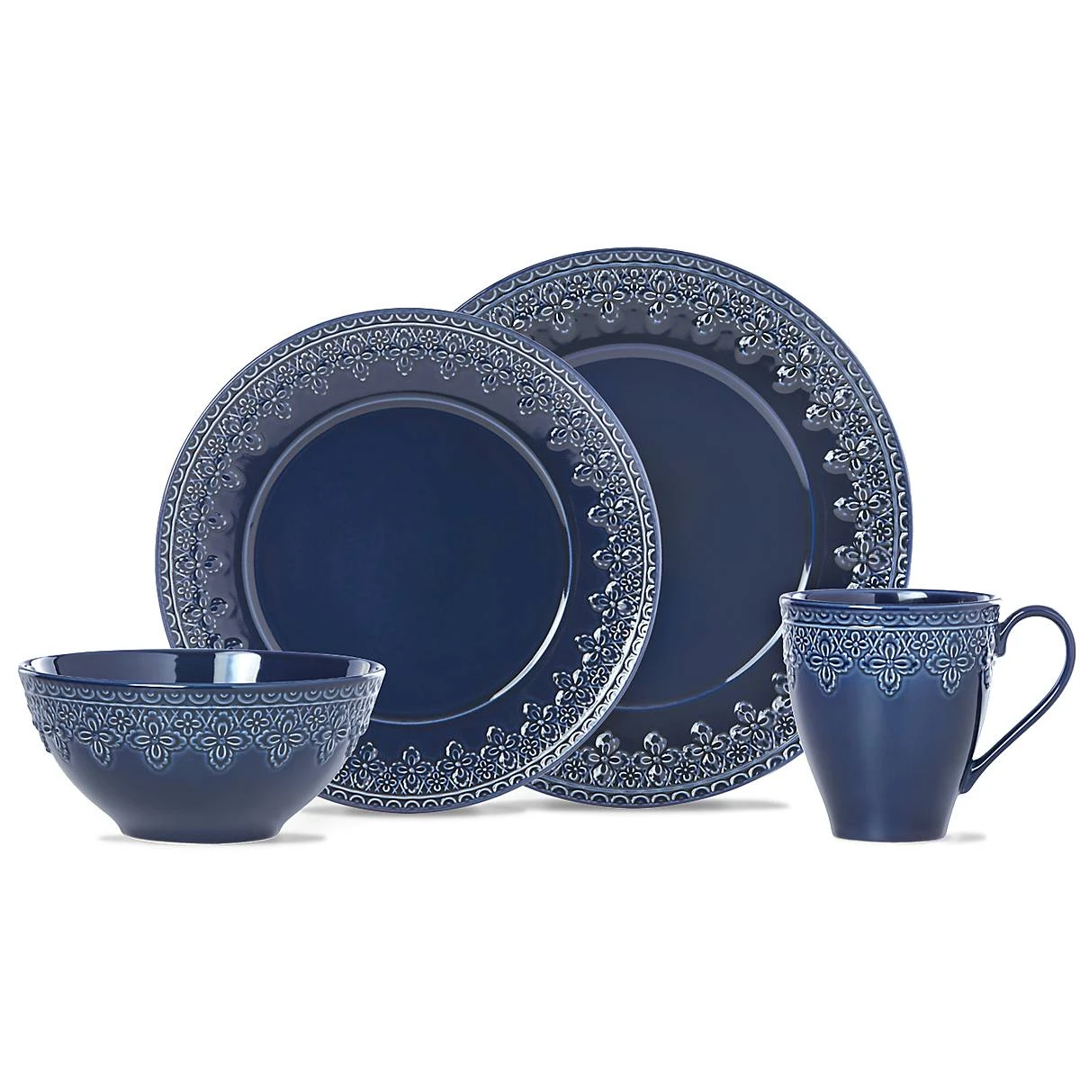 Reminiscent of French matelassé technique, The Chelse Muse Fleur Navy 4-piece Place Setting boasts an intricate quatrefoil pattern carved around the edges with a reactive glaze. This rich navy ironstone dinnerware is dishwasher and microwave-safe.
