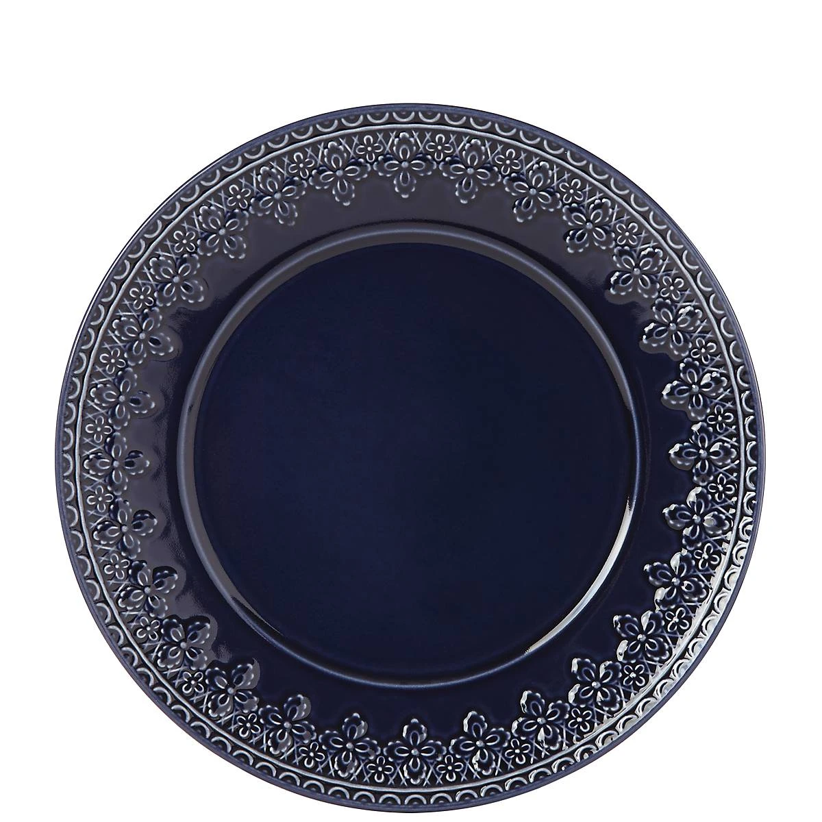 Reminiscent of French matelassé technique, The Chelse Muse Fleur Navy Accent Plate boasts an intricate quatrefoil pattern carved around its edge with a reactive glaze. This rich navy ironstone dinnerware is dishwasher and microwave-safe.
