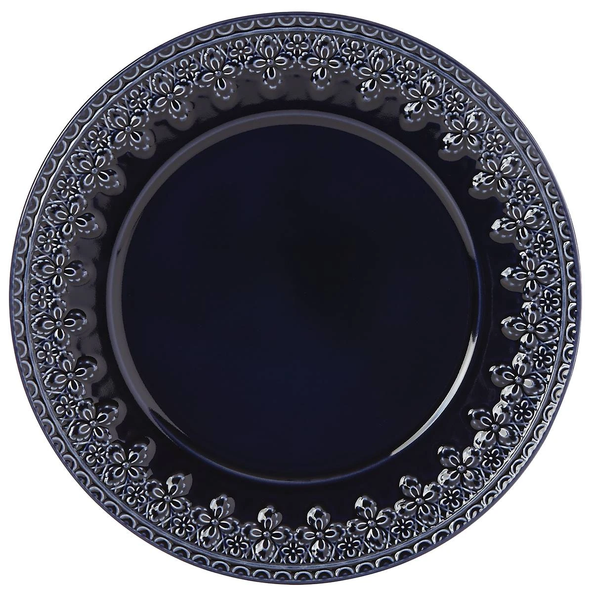 Reminiscent of French matelassé technique, the Chelse Muse Fleur Navy Dinner Plate boasts an intricate quatrefoil pattern carved around its edge with a reactive glaze. This rich navy ironstone dinnerware is dishwasher and microwave-safe.