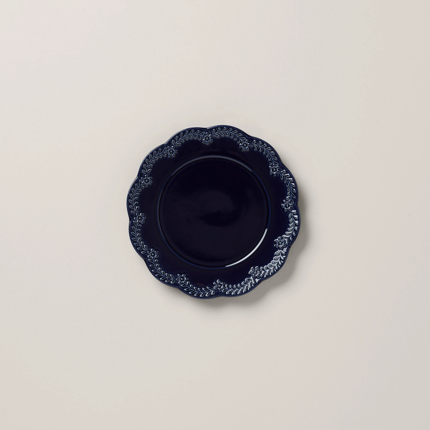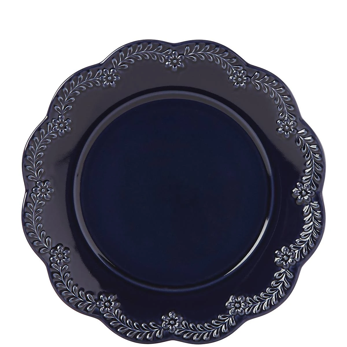 The Floral Navy Accent Plate showcases an elegant wreath of opposite-leafed branches and flowers following scalloped edges with a reactive glaze. This dishwasher and microwave-safe dinnerware from the Chelse Muse Collection is crafted in navy ironstone.