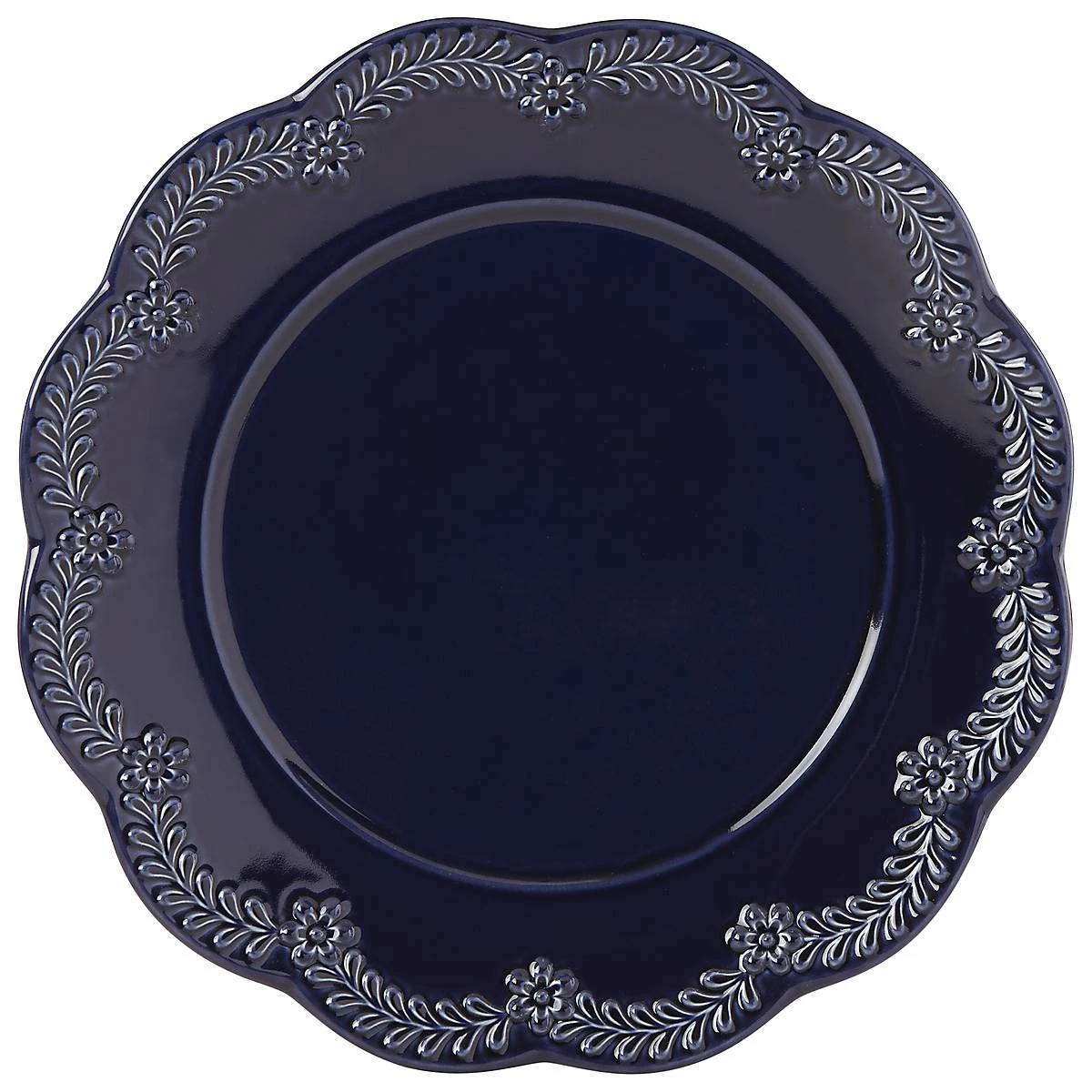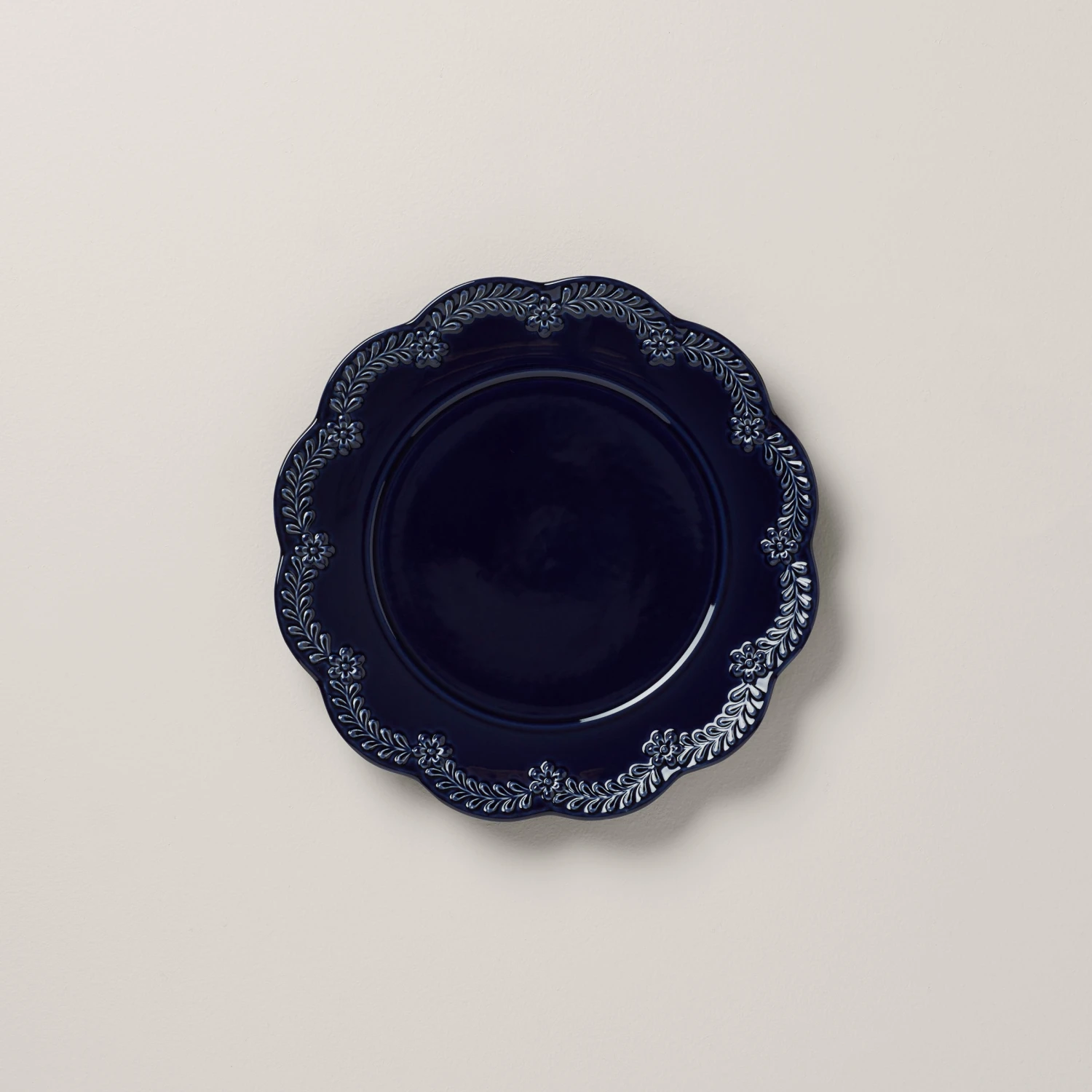 The Chelse Muse Floral Navy Dinner Plate showcases an elegant wreath of opposite-leafed branches and flowers following scalloped edges with a reactive glaze. This dishwasher and microwave-safe dinnerware from the Chelse Muse Collection is crafted in navy ironstone.