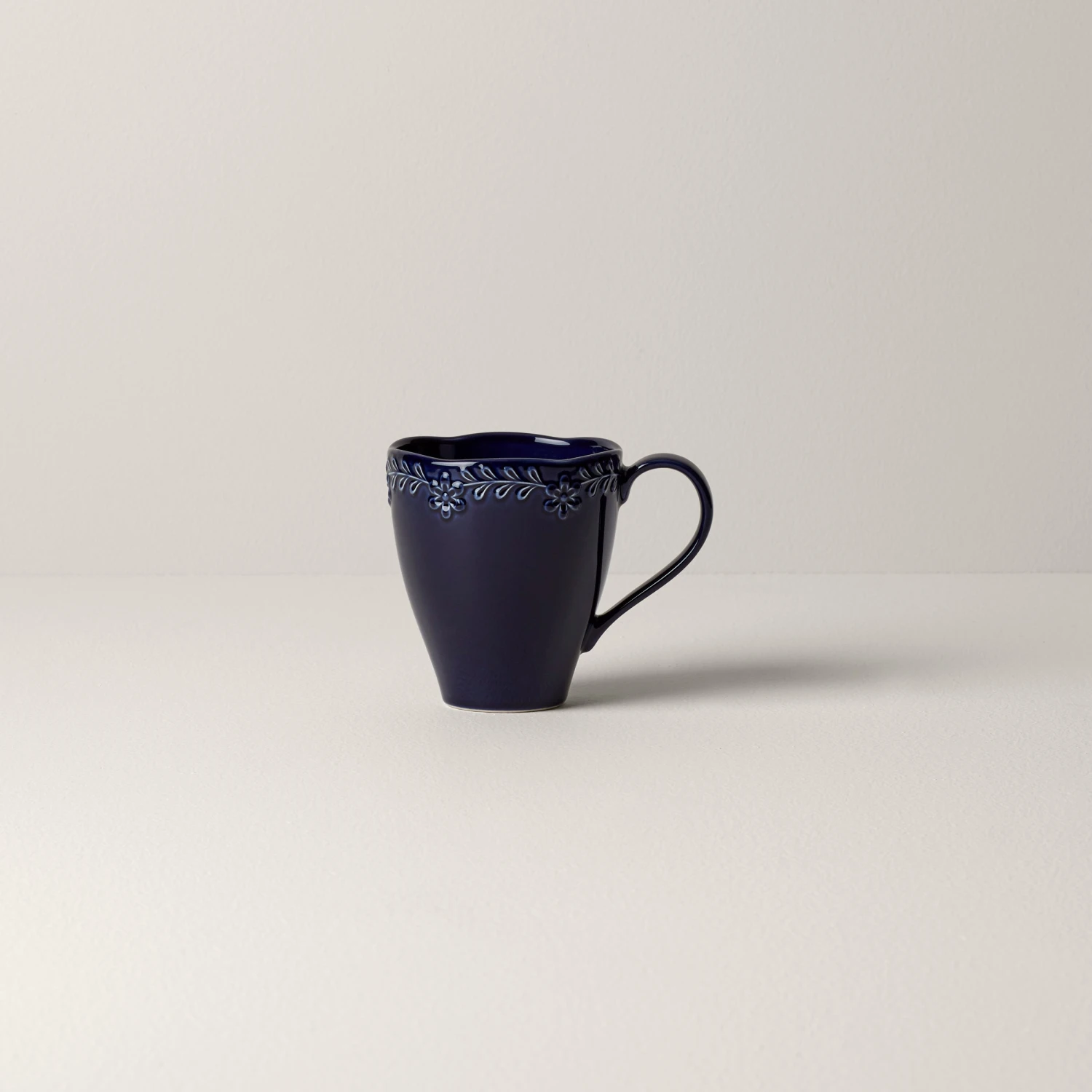 The Chelse Muse Floral Navy Mug showcases an elegant wreath of opposite-leafed branches and flowers following scalloped edges with a reactive glaze. This dishwasher and microwave-safe dinnerware from the Chelse Muse Collection is crafted in navy ironstone.