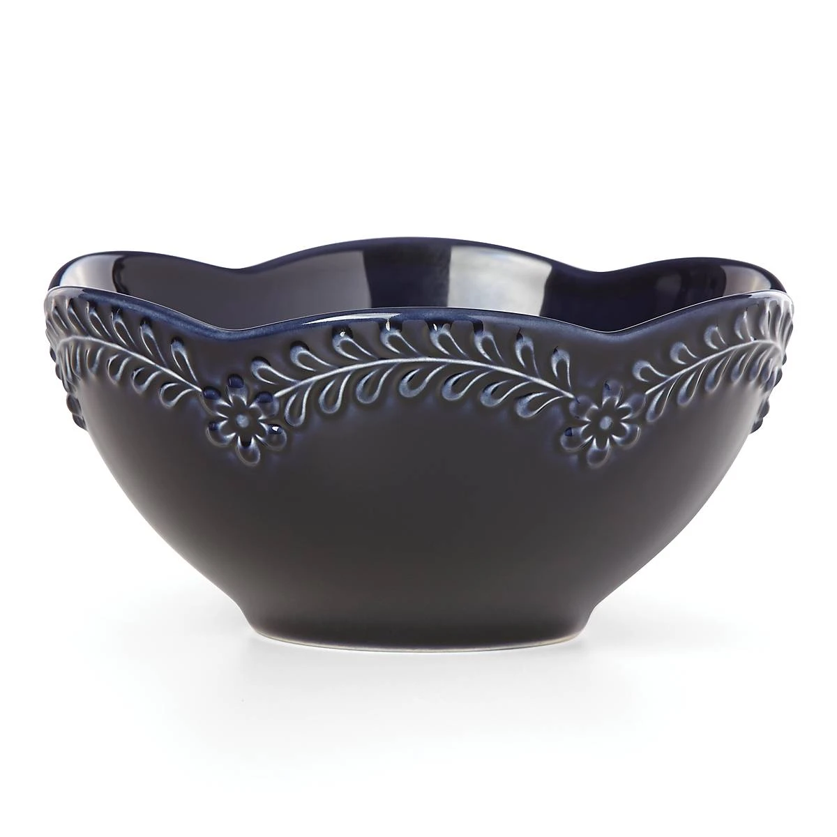 Ideal for snacks, tabletops, and prep, the Floral Navy All-Purpose Bowl showcases an elegant wreath of opposite-leafed branches and flowers following scalloped edges with a reactive glaze. This dishwasher and microwave-safe dinnerware from the Chelse Muse Collection is crafted in navy ironstone.