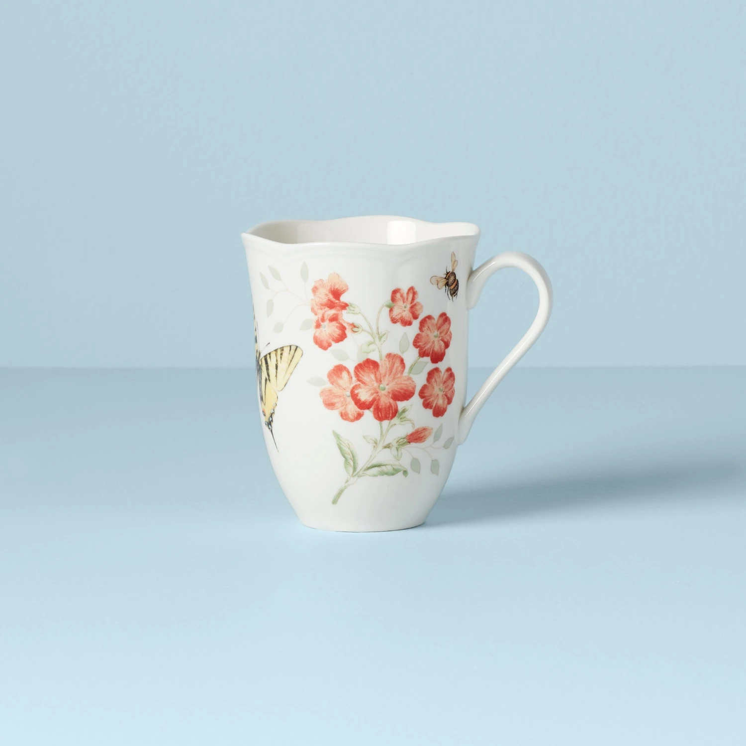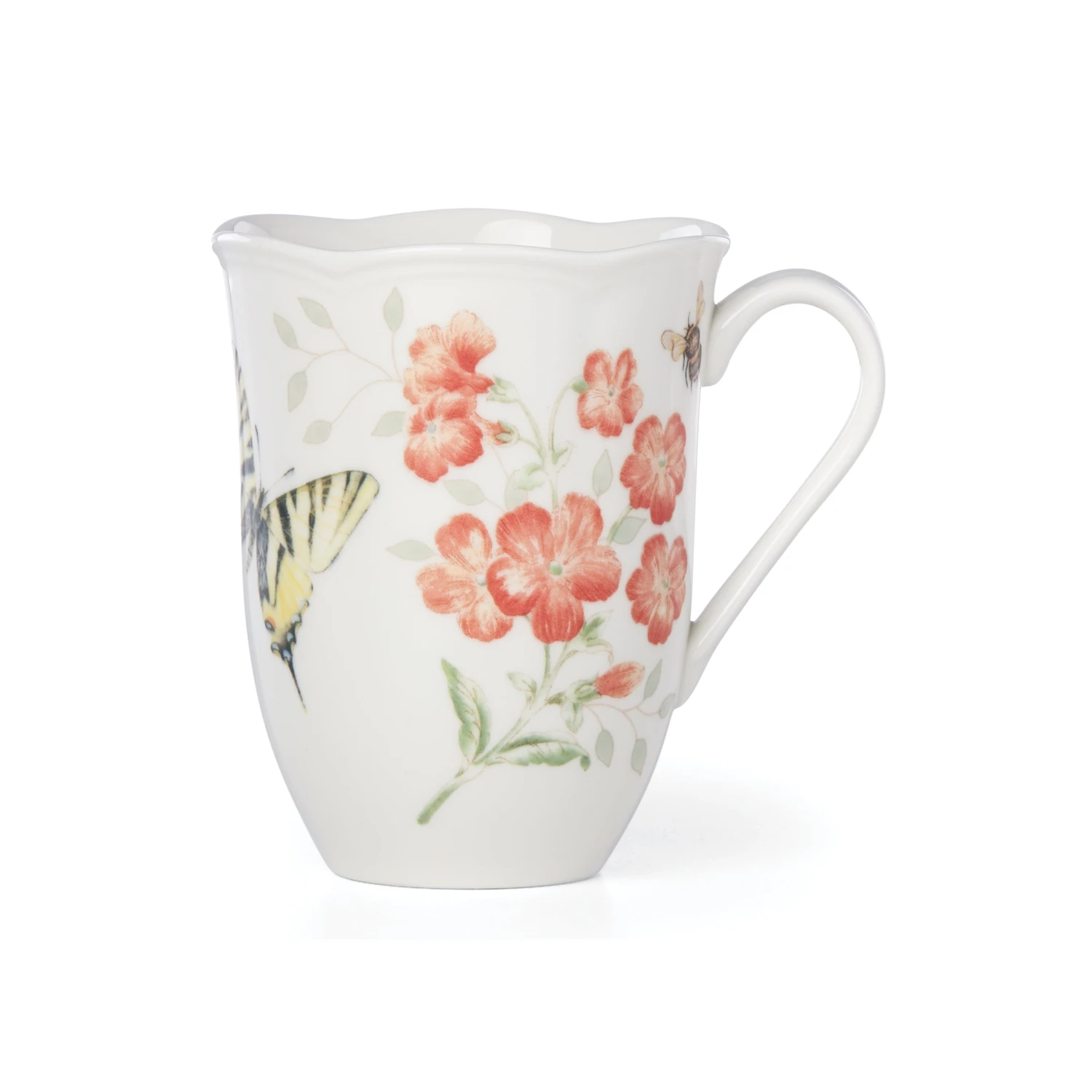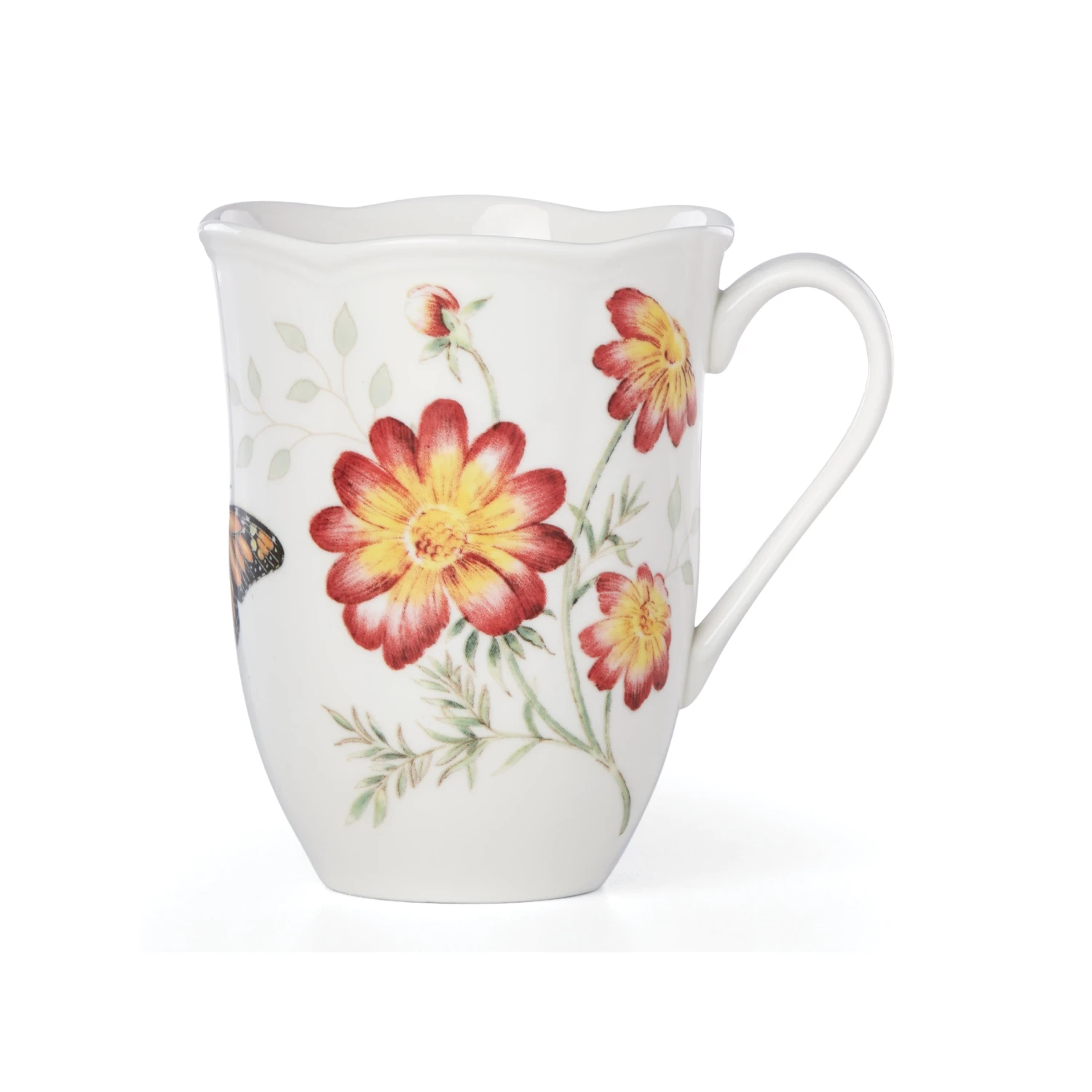 Bright red flowers add luscious detail to our charming Butterfly Meadow pattern. This mug brings a springtime look to your table with its scalloped edge and swallowtail butterfly artistry.