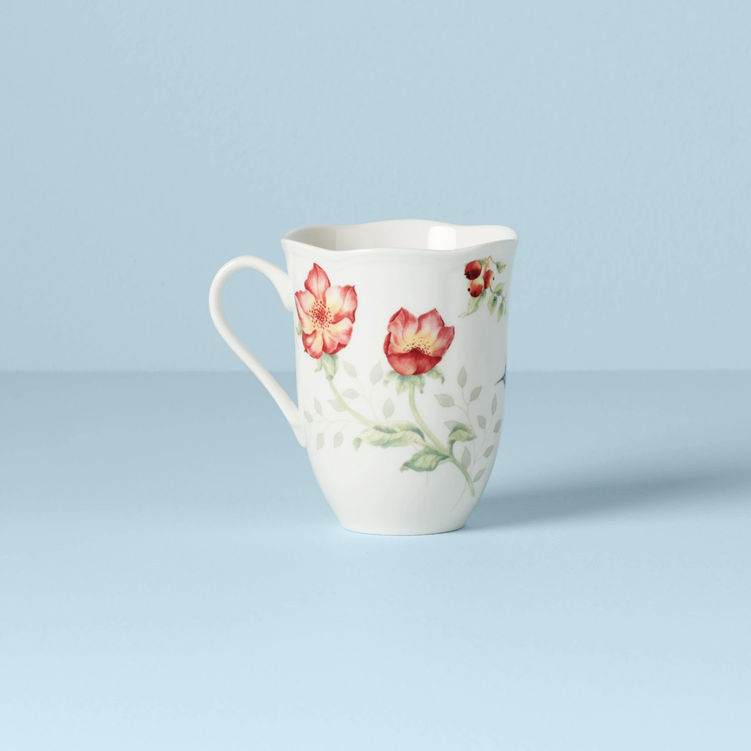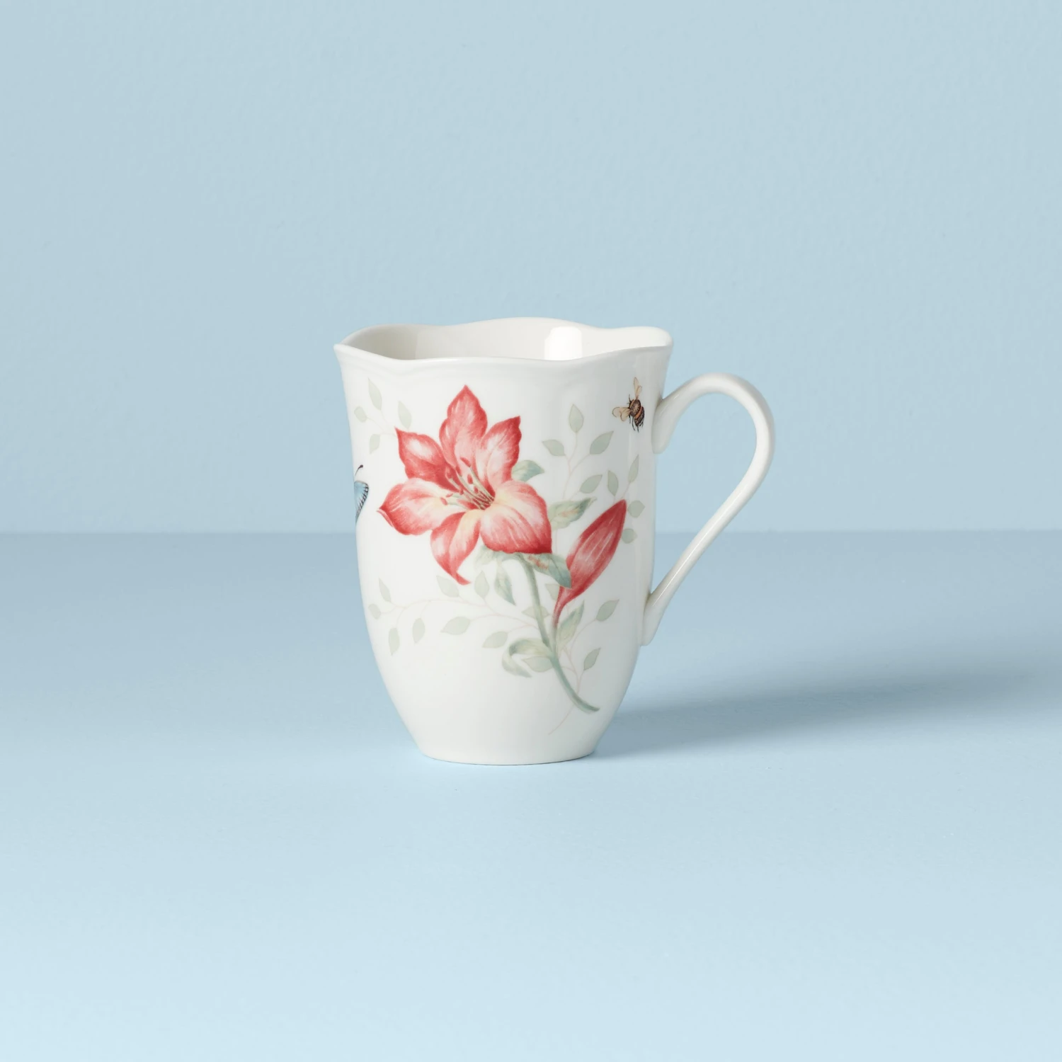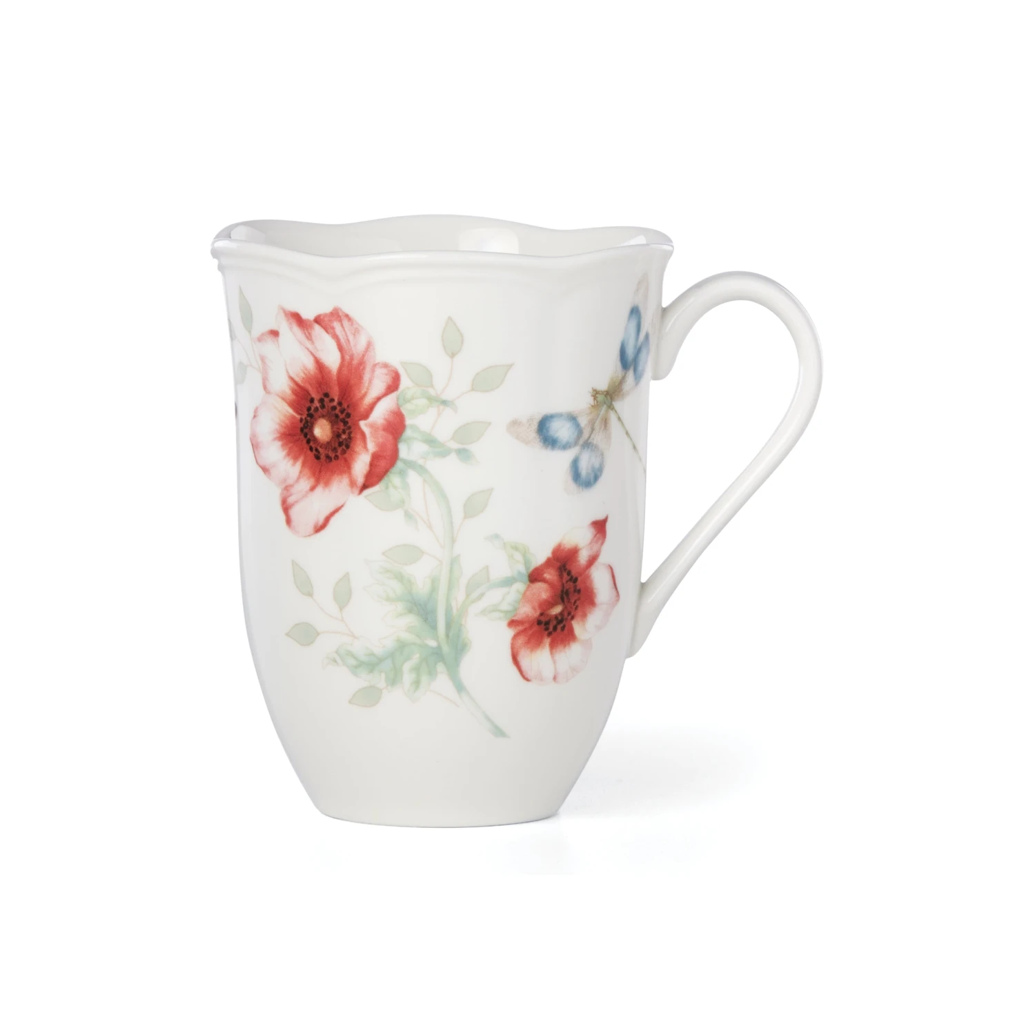 Bright red flowers add luscious detail to our charming Butterfly Meadow pattern. This mug brings a springtime look to your table with its scalloped edge and swallowtail butterfly artistry.