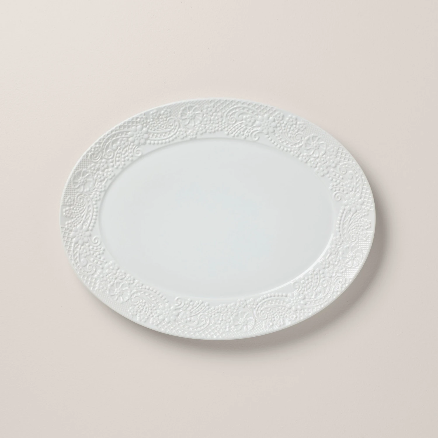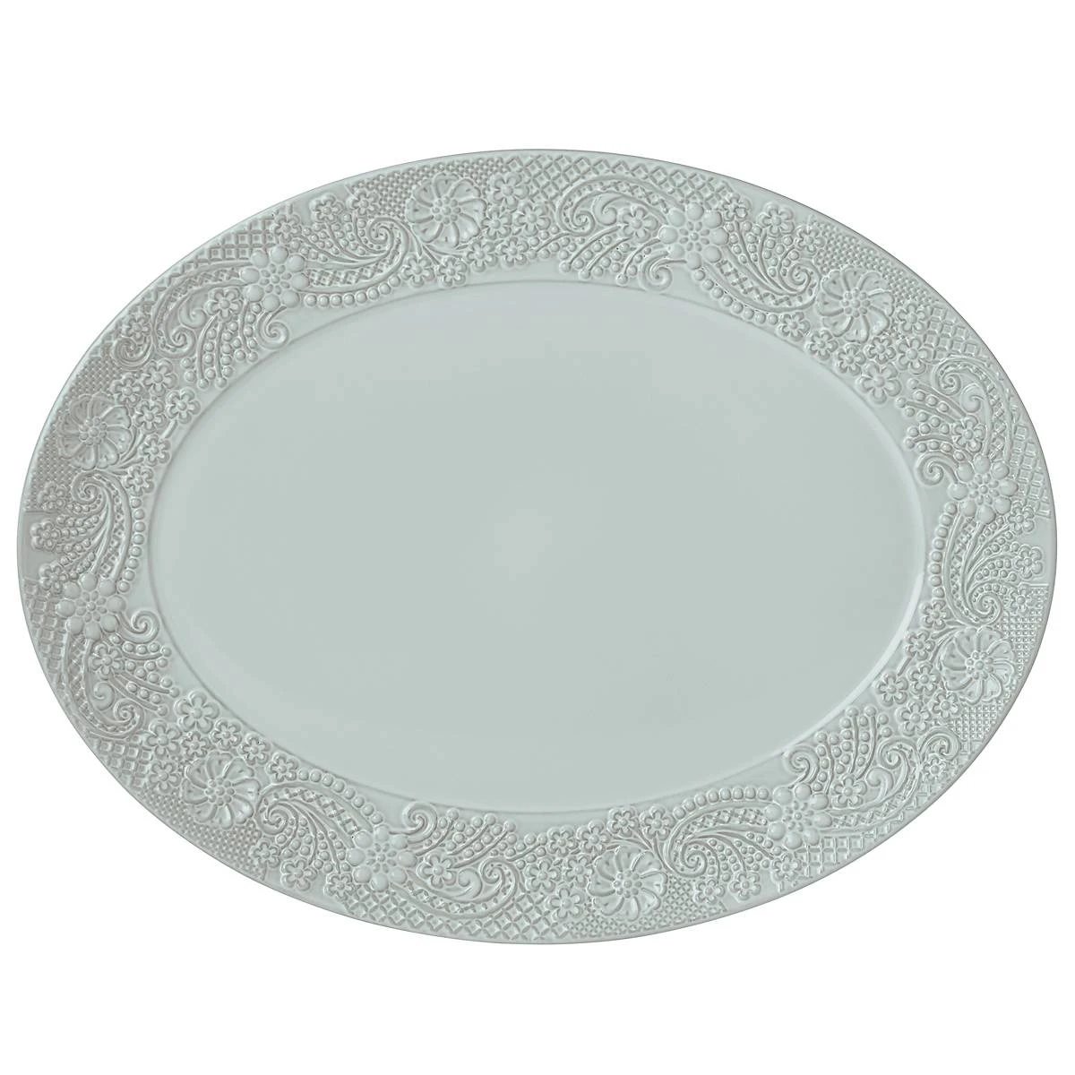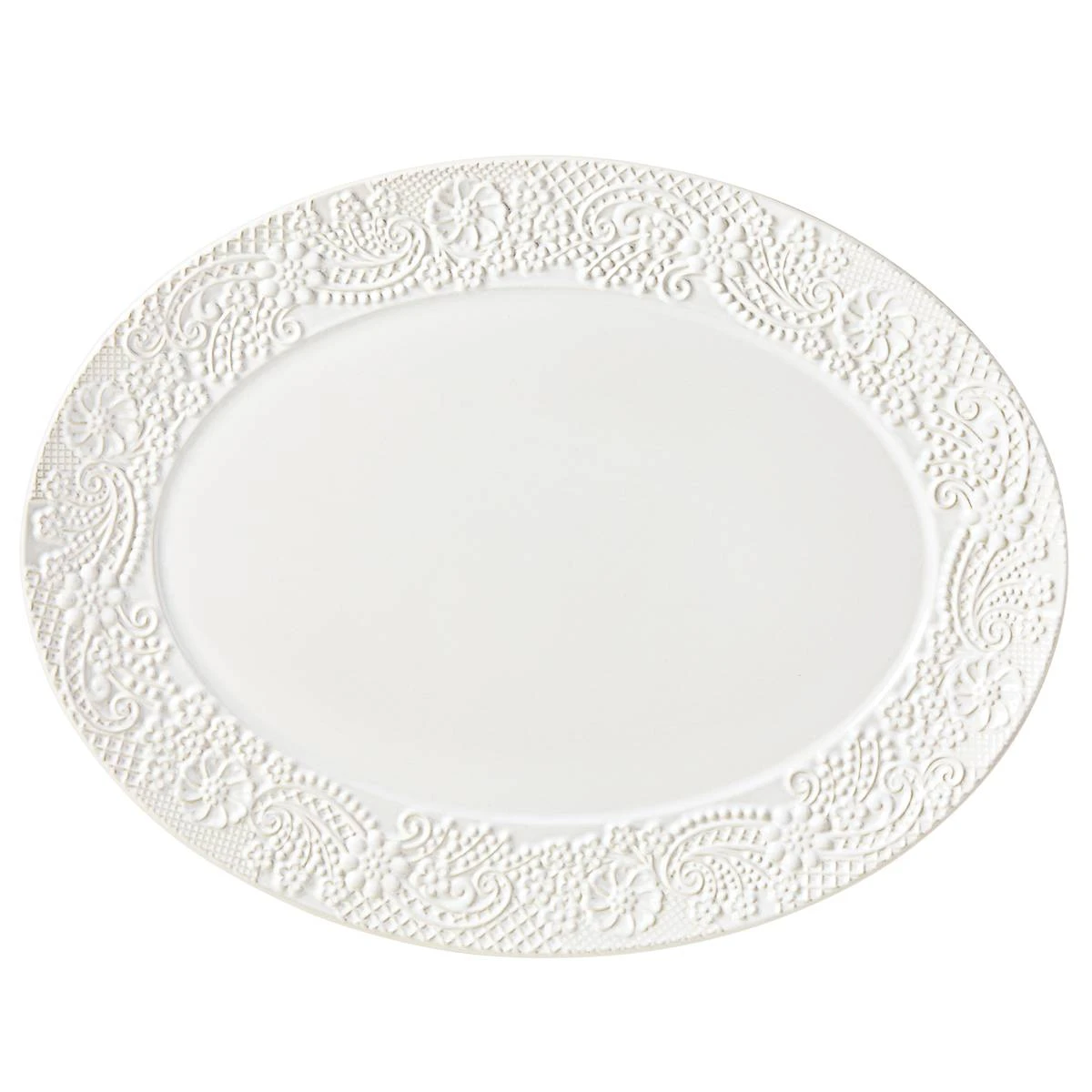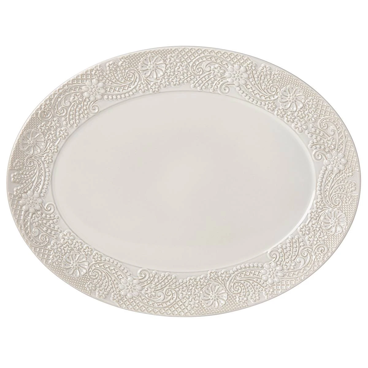 An intricate pattern of carved paisley forms a wide border around the Chelse Muse White 16.5″ Oval Serving Platter. This dishwasher and microwave-safe serveware from the Chelse Muse Collection is crafted in white ironstone with a reactive glaze. A charming serving piece for casual and formal gatherings.