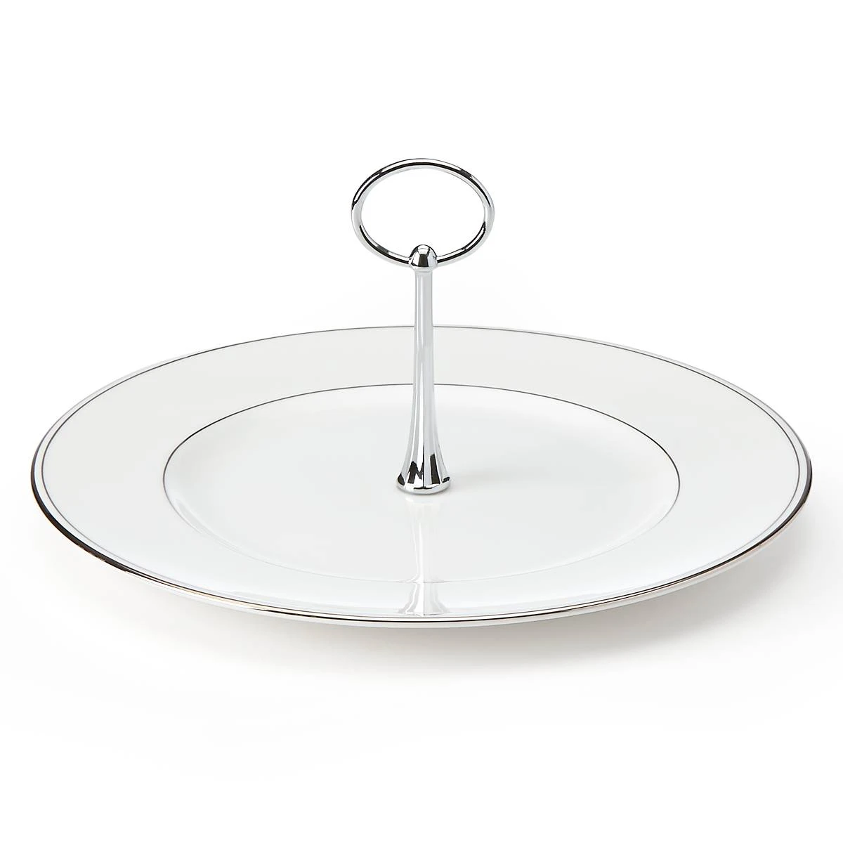 Ideal for serving desserts and other delicious small bites, the Federal Platinum Dessert Server features pristine white surfaces and a convenient handle that comes up from its center. Crafted from durable white bone china, this server is accented in precious platinum.