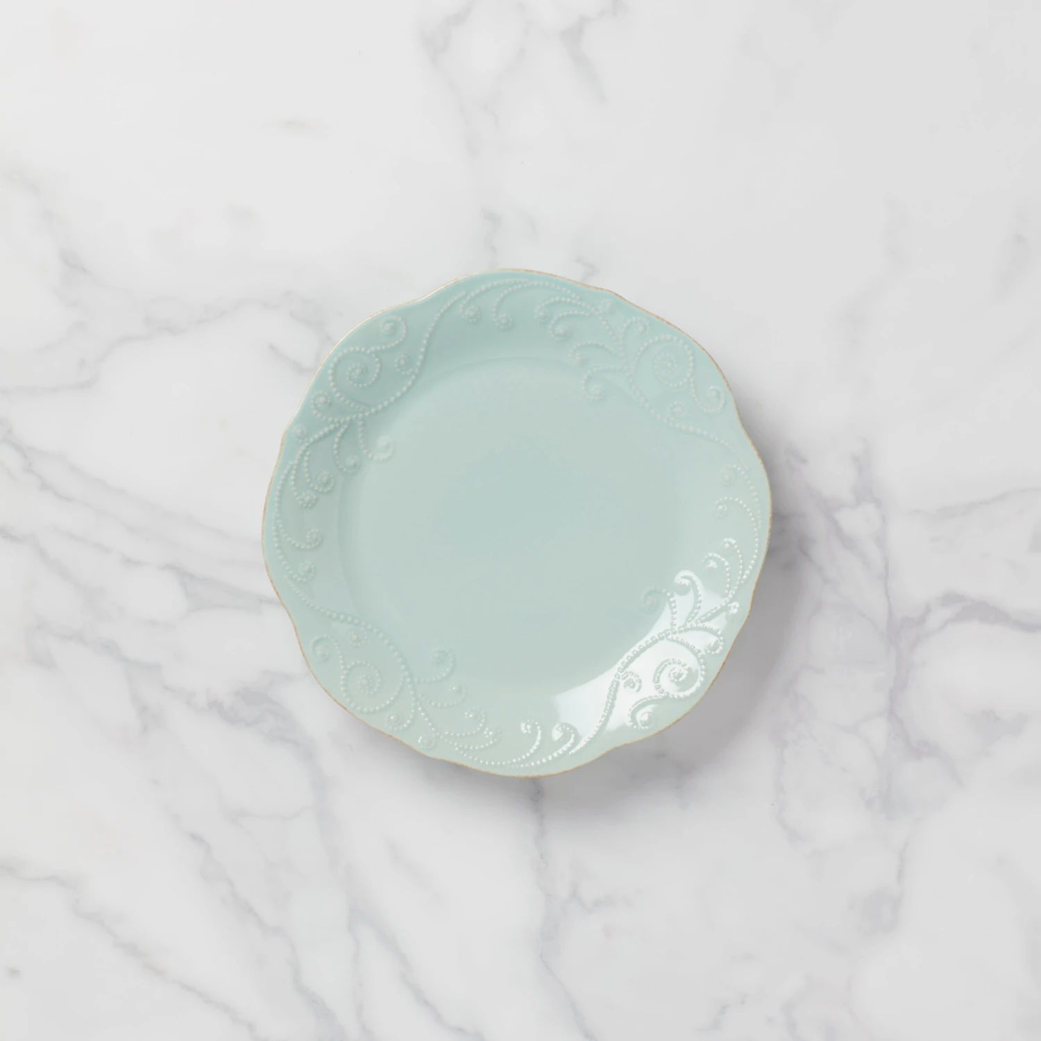 Including a soft scalloped border, and gentle hand-enameled dots accented with a subtle tea stain, this durable ceramic stoneware dinner plate is a cool ice blue that elevates mealtime from ordinary to exceptional. This item is microwave and dishwasher-safe, for added convenience.