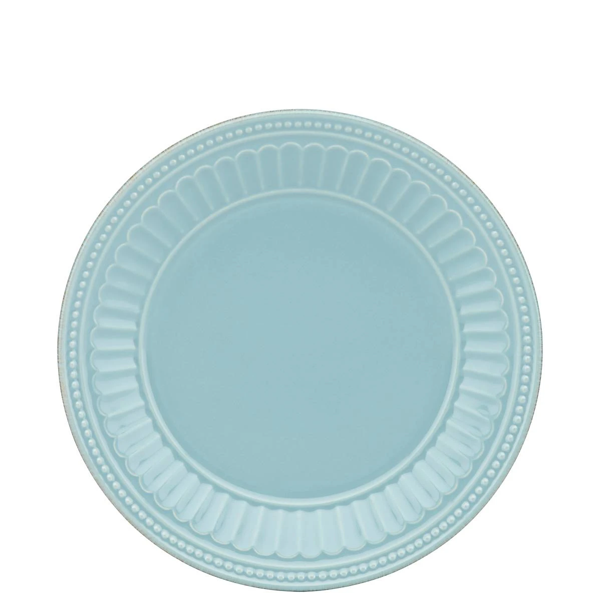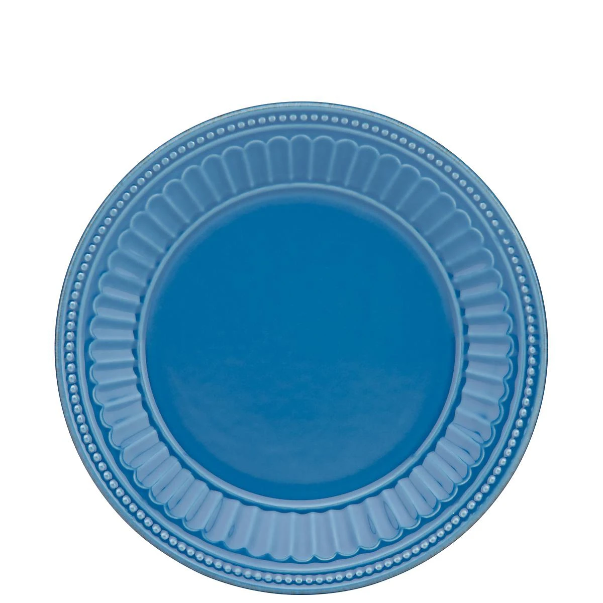 Intricate detailing inspired by hand-embroidered fabrics decorates the French Perle Groove Marine Dessert Plate.