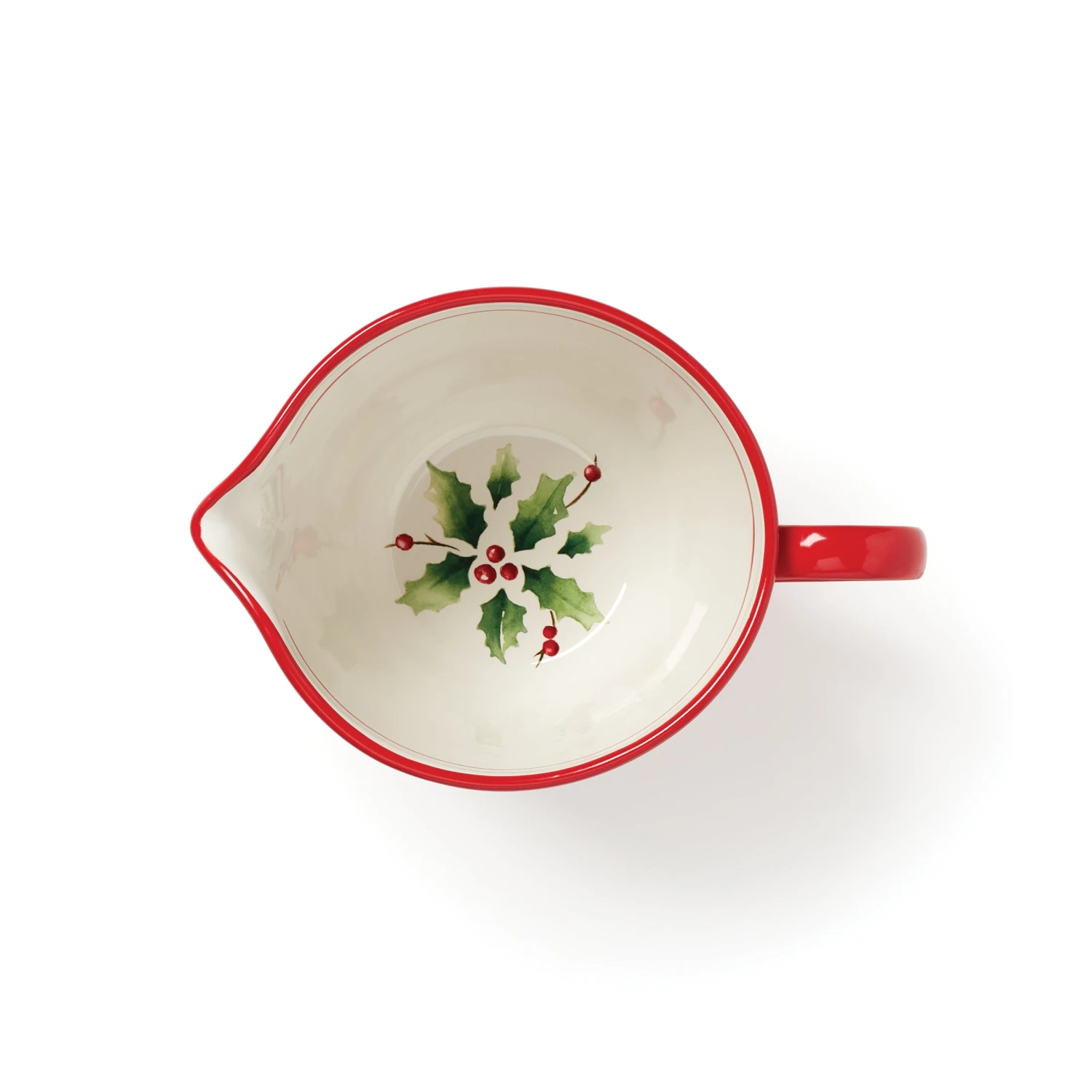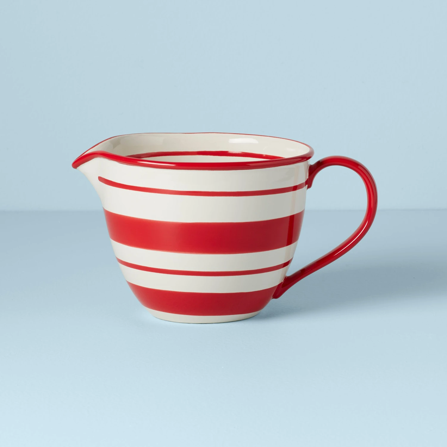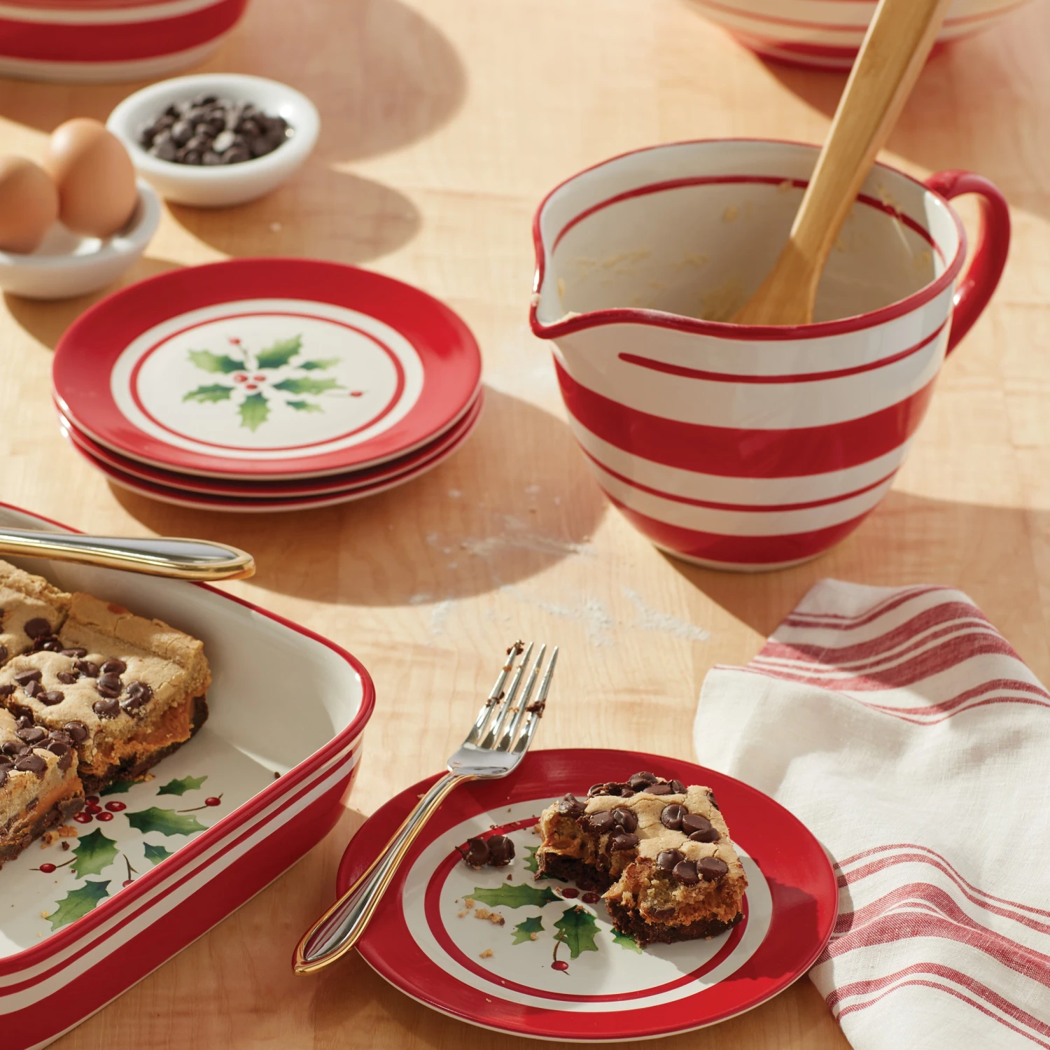 This batter bowl is perfect for all your festive baking needs. When you peek inside, the bottom of the interior is accented with a pretty painterly holly leaf with berries. This cheerful striped piece is sure to brighten up any kitchen!