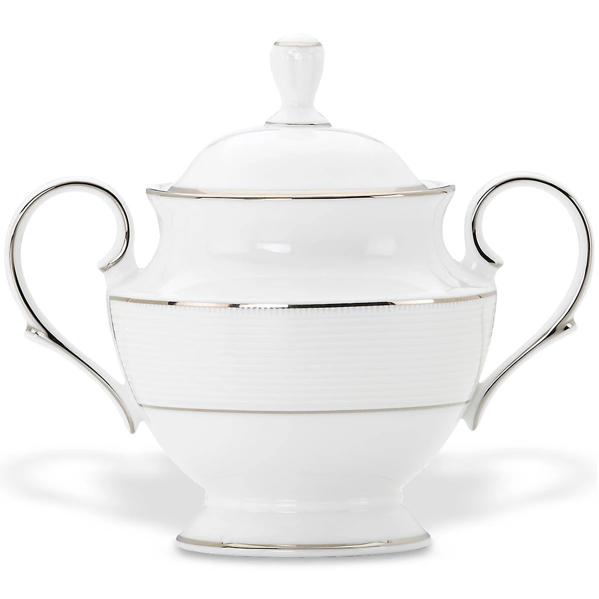 Ideal for a tea time or dessert course, the elegant and classic Opal Innocence Stripe Sugar Bowl includes a removable lid, and features a textured motif of raised white ribbons. This ornate and durable bone china sugar bowl is accented in precious platinum, and is dishwasher-safe for added convenience.