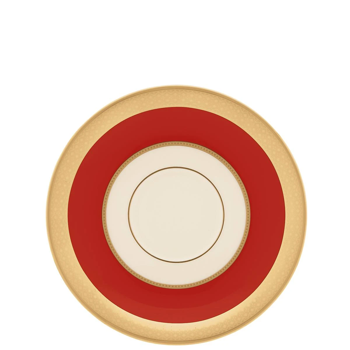 Part of the Embassy Collection, this durable ivory bone china saucer is a regal choice for the dinner table, with its brilliant gold and rich red bands and 24-karat gold accents along the outer rim. This item is dishwasher-safe, for added convenience.