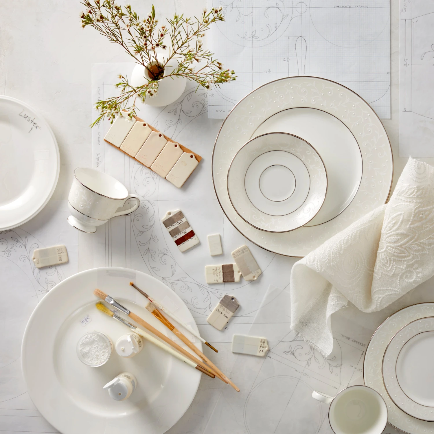 The regal and sophisticated Opal Innocence 5-piece Place Setting features a gleaming pearlescent motif of hand-applied enamel dots. Accented in precious platinum, this durable bone china place setting is dishwasher-safe for added convenience.