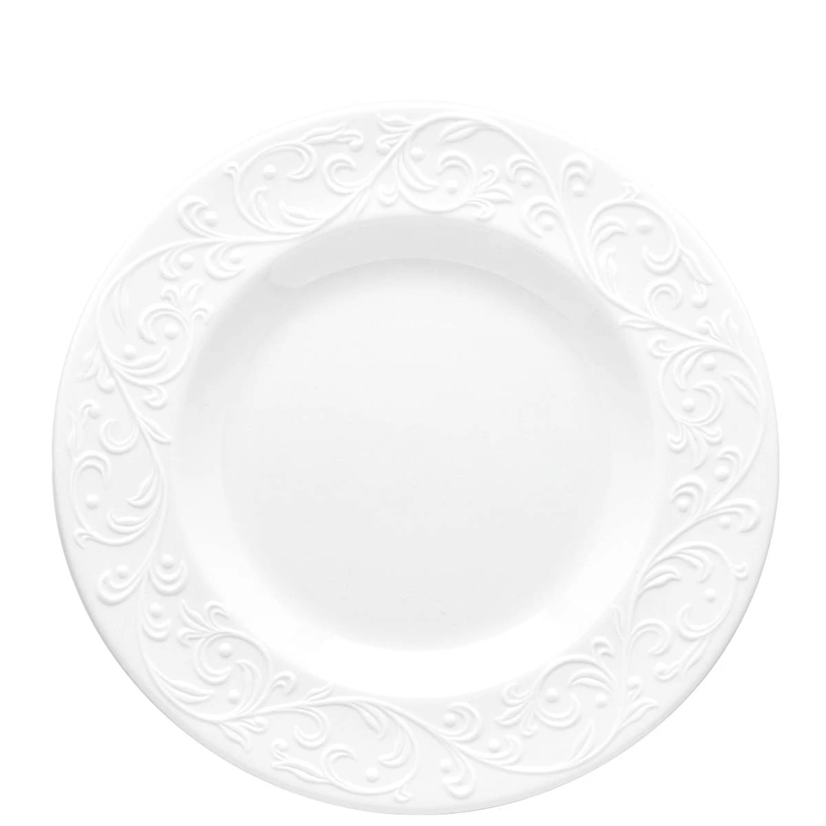 The simply elegant Opal Innocence Carved 9″ Accent Plate features a flowing scroll motif in a raised relief on its pristine white rim. This casual and durable ceramic porcelain accent plate is also microwave and dishwasher-safe, for added convenience.