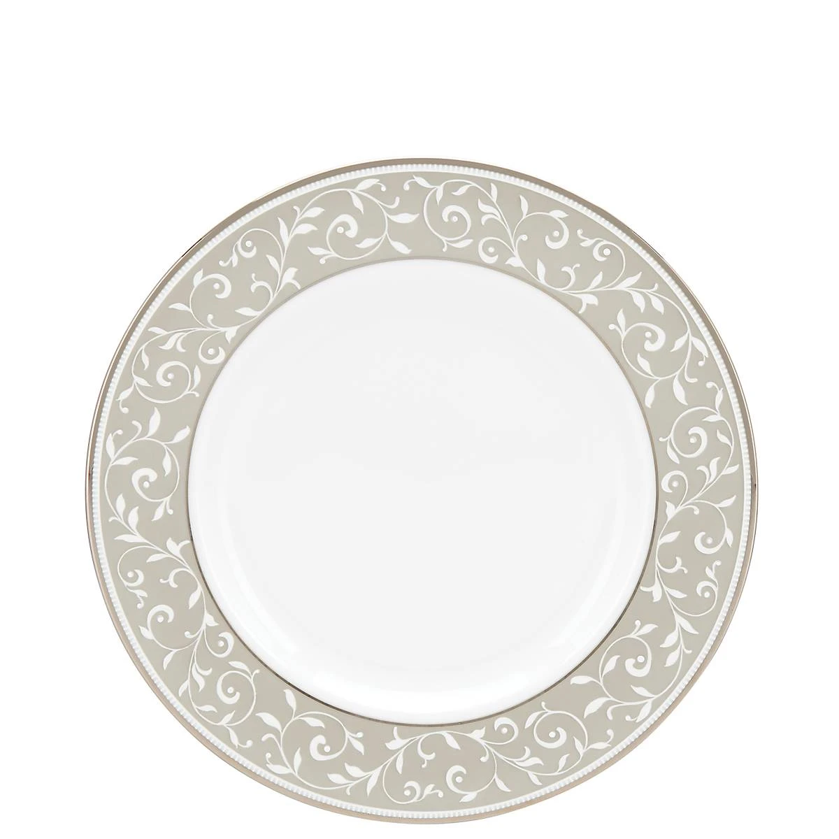 The lavish and tranquil Opal Innocence Dune Salad Plate features a pristine white surface and a delicate motif of scrolling dots inside of a taupe frame. This ornate and durable bone china salad plate is accented in precious platinum, and is dishwasher-safe for added convenience.