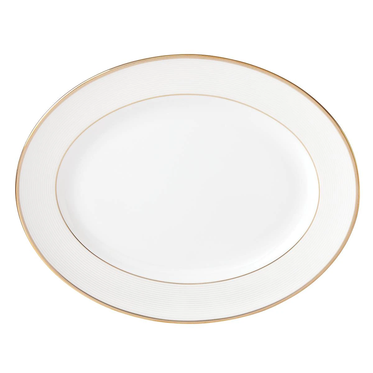 Ideal for presenting a small roast or delicious side course, the elegant and classic Opal Innocence Stripe Gold 13″ Oval Serving Platter features a textured motif of raised white ribbons. This ornate and durable bone china platter is accented in precious 24-karat gold, and is dishwasher-safe for added convenience.