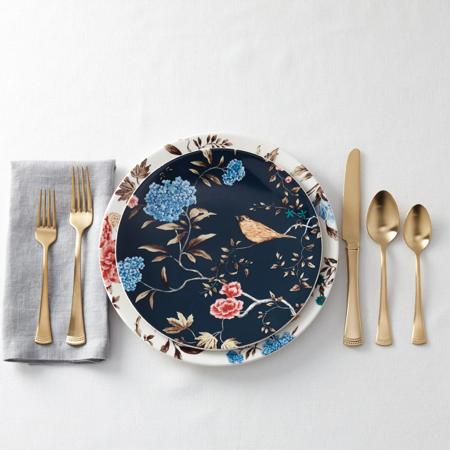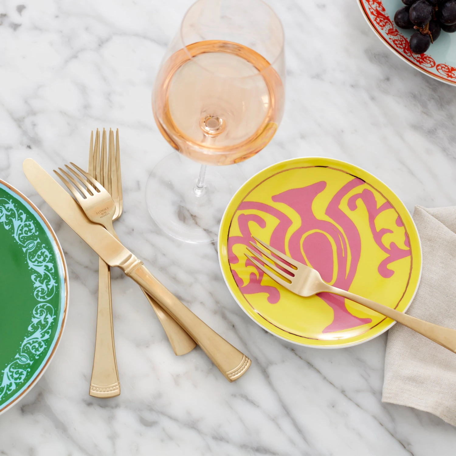 The same classic Portola flatware that you know and love, now in a gold satin finish. Complete with flared handles and a beaded channel at each base, this set includes forks, salad forks, knives, spoons and teaspoons that’s perfect for serving four people.