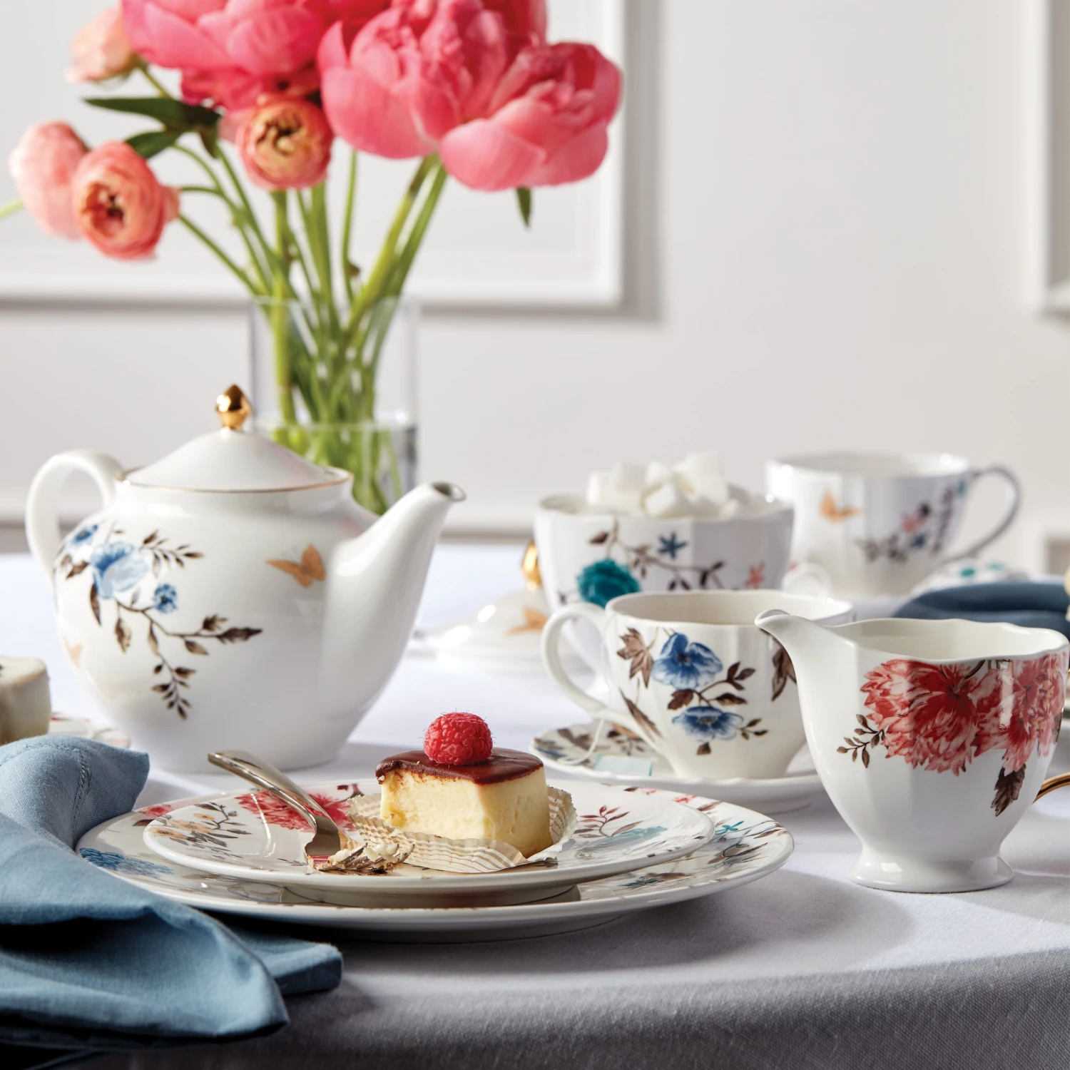 Bring the beauty and bright colors of a lush English garden to your home with the Sprig & Vine collection. This sugar bowl and creamer set features botanical illustrations inspired by vintage textiles. The golden handle on the creamer is the perfect touch to give this set a gleaming finish.