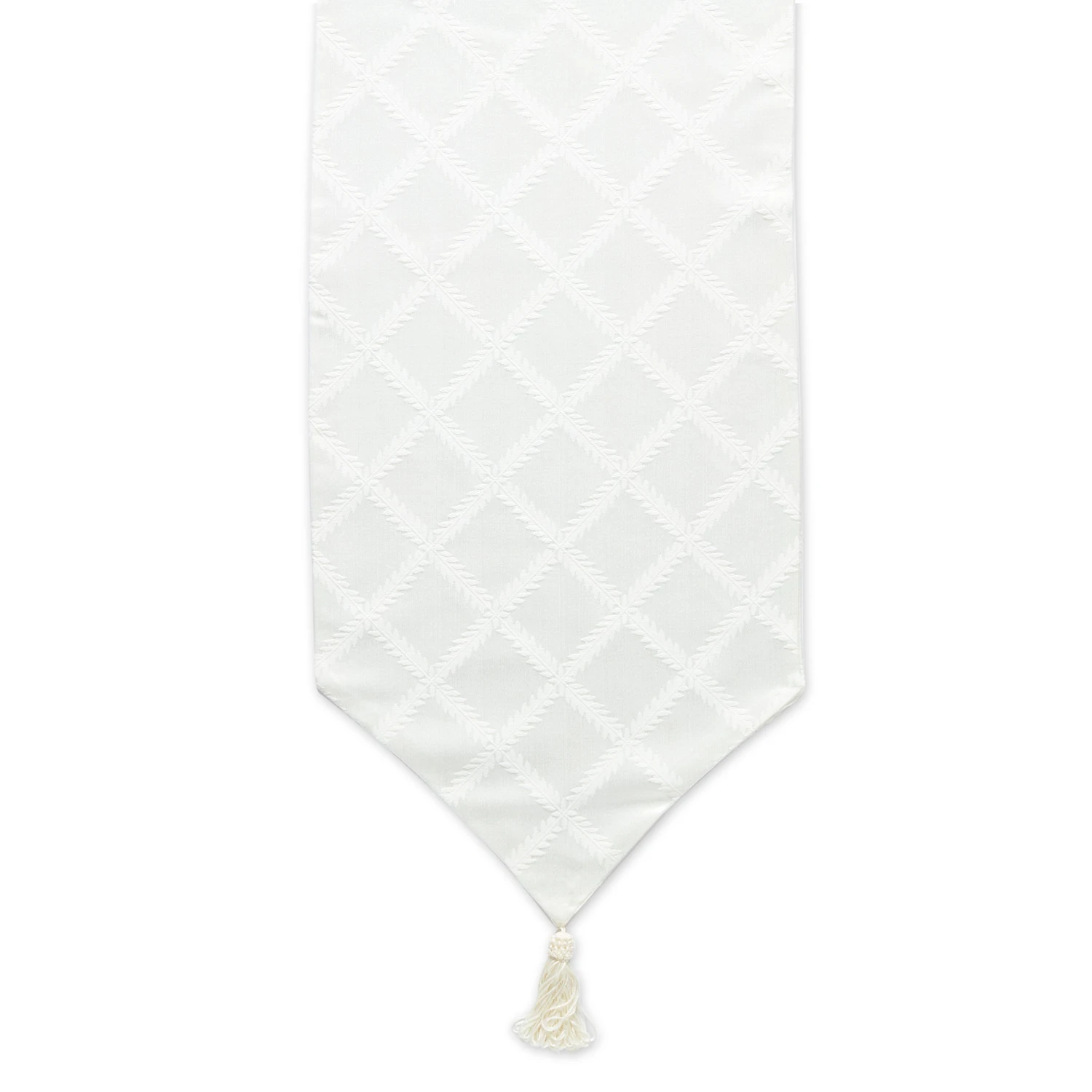 Create an elegant look on your table with this gorgeous white table runner. A refined laurel leaf pattern in overlapping diamonds brings a distinguished display for every meal.