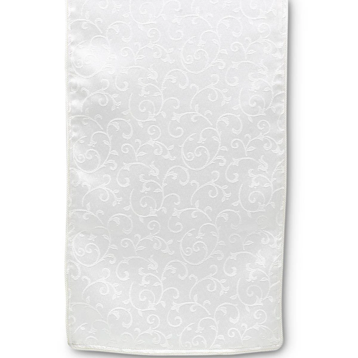 The Opal Innocence White Runner Featuring an elegant scroll damask, the Opal Innocence table runner is the perfect addition to your table. This hemmed runner has a decorative corded edge that adds luxury and distinction to the rich pattern.